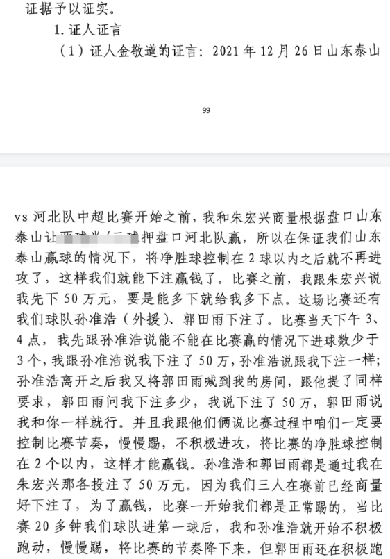 金敬道證言:踢河北我和孫準(zhǔn)浩、郭田雨各下注50萬,一起控制節(jié)奏